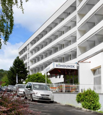 Hotel Běhounek, modernizovaný v roce 2019 a umístěný ve svahu nad jáchymovským údolím tvoří nepřehlédnutelnou dominantu města Jáchymov.