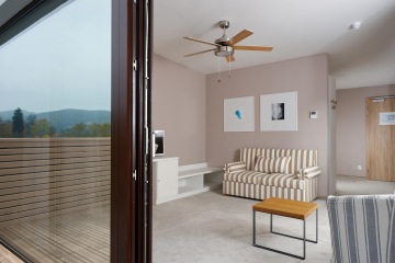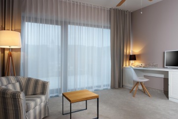 Luxusní dvoupokojové apartmá pro náročné, ve kterém máte sami pro sebe 44 m2. Obývací pokoj se sofa, co přímo svádí k relaxaci, ložnici s manželskou postelí o rozměrech 180 x 200 a prostornou koupelnu se sprchou. A k tomu soukromou terasu, odkud můžete pozorovat dění na golfovém hřišti. Ve vybavení najdete vše, co potřebujete ke spokojenému pobytu, včetně televize, minibaru a trezoru. Cena pokoje zahrnuje vstup do wellness Spa Academy.
