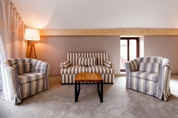 Lassen Sie sich nicht durch Quadratmeter einschränken. Schon beim ersten Öffnen der Tür werden Sie sich in die großzügige Junior-Suite verlieben. Modernes Badezimmer mit Dusche, gemütliches Sofa im Wohnzimmer und ein Bett mit den Maßen 180 x 200. Auch hier finden Sie sämtliche Standardausstattung (TV, Minibar, Sicherheitsfach oder Haartrockner) Diese Zimmer haben keinen Balkon, aber Sie können den Blick auf den Golfplatz vom Fenster aus genießen. Ihre Größe beträgt 40 m2. Der Eintritt in die Wellness Spa Academy ist ebenfalls im Preis für die Unterkunft inbegriffen.