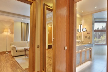 Retro Riverside bietet drei Zweizimmerapartments mit einer Fläche von 56 m2, die sich in den Ecken des Hotelgebäudes im 2. und 3. Stock befinden. Schon beim Überschreiten der Schwelle verlieben Sie sich nicht nur in den lichtdurchfluteten Innenraum, sondern vor allem in die großzügige Terrasse mit Panoramablick auf die atemberaubende Landschaft. Freier Eintritt ins Wellnesscenter ist ebenfalls im Preis inbegriffen.