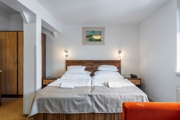 Schöne Doppelzimmer in der Dependance Dalibor mit wahrhaft überlegenem Platz und dem Vorteil einer Küchenzeile mit Esstisch. Verbindung mit Běhounek durch den Korridor.