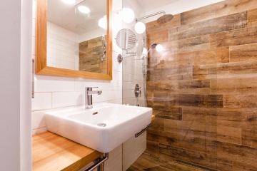 - Badezimmer mit Dusche, Kosmetikspiegel und Haartrockner
