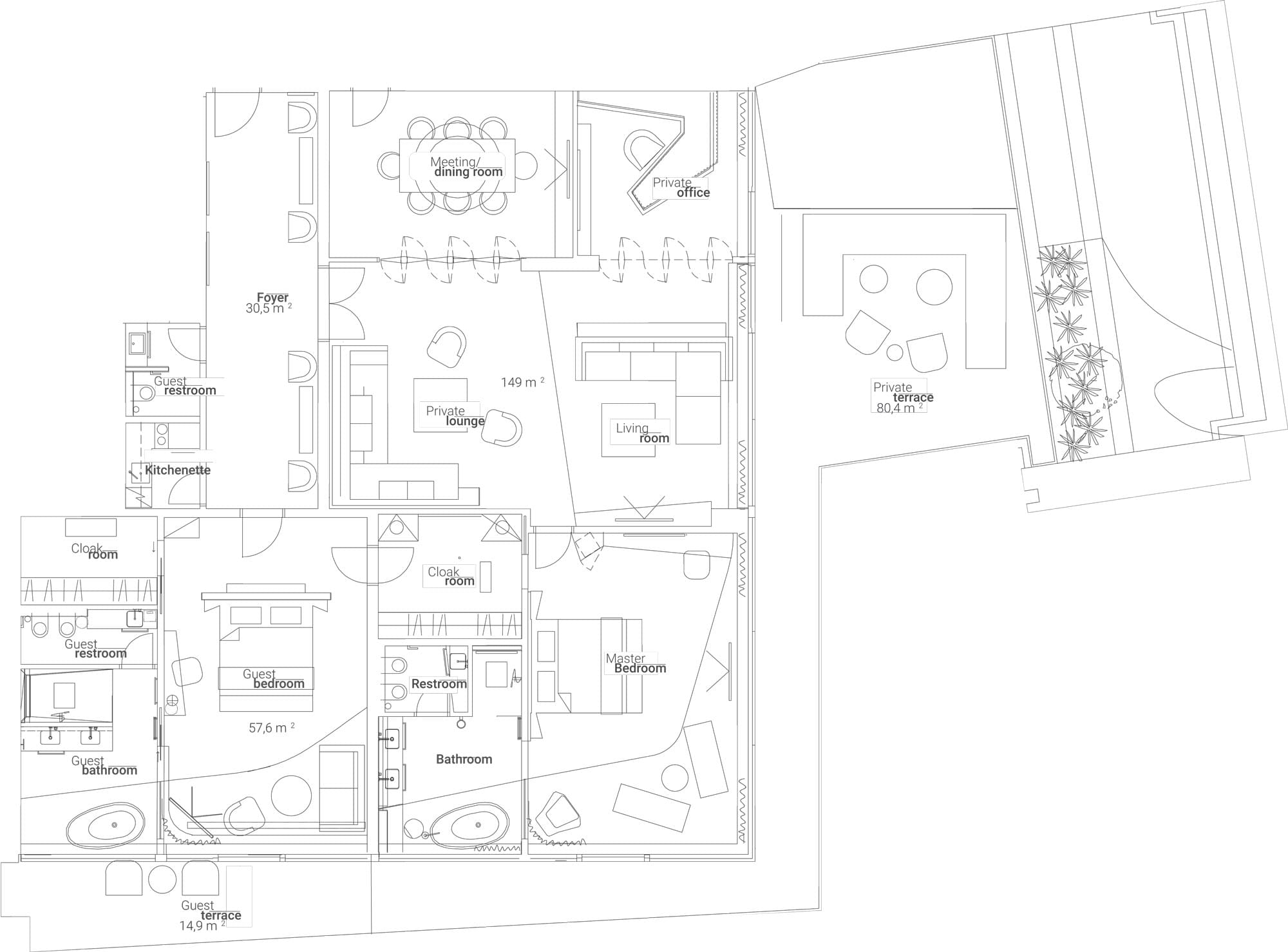 The breathtaking views to the Prague Castle in ensemble to glamorous, impeccably designed and chic furnished rooms with total size of 227 sqm. Expansive lounge with the terrace 77 sqm, a distinguished meeting or dining area, luxury working area and 2 gorgeous bedrooms are complemented with modern amenities. The convenience of a fully equipped kitchenette and 2 luxury wardrobes . The spacious bathroom is pure indulgence with an open-bath and a sublime walk-in shower and bidet.